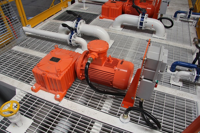 地面鉆井液泥漿系統(tǒng)的作用是使泥漿在被泵入井眼前允許維護處理。這可以通過有效使用固控設備清除不需要的固相來實現(xiàn),同時盡可能多得回收再利用鉆井液泥漿。固相清除后,接下來是化學添加劑和鉆井液泥漿材料快速完全的混合等維護工作。泥漿攪拌器的充分攪拌對固相清除和泥漿維護工作來說是十分必要的。大部分泥漿都必須用泥漿攪拌器來懸浮地面泥漿罐中的固相,使泥漿成分保持均勻。能達到這種目的的設備有兩種:泥漿攪拌器和泥漿槍。兩者都被廣泛應用。